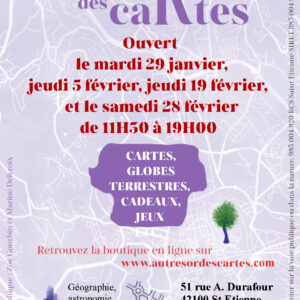 Le 51 rue Antoine Durafour à Saint Étienne vous accueillera en février le jeudi 5, jeudi 19 et le samedi 28 de 11h30 à 19h00. Comme habituellement, vous y trouverez des cartes, des affiches, des globes terrestres, des puzzles, des vins locaux et des livres autour des paysages et de la géographie. ...
